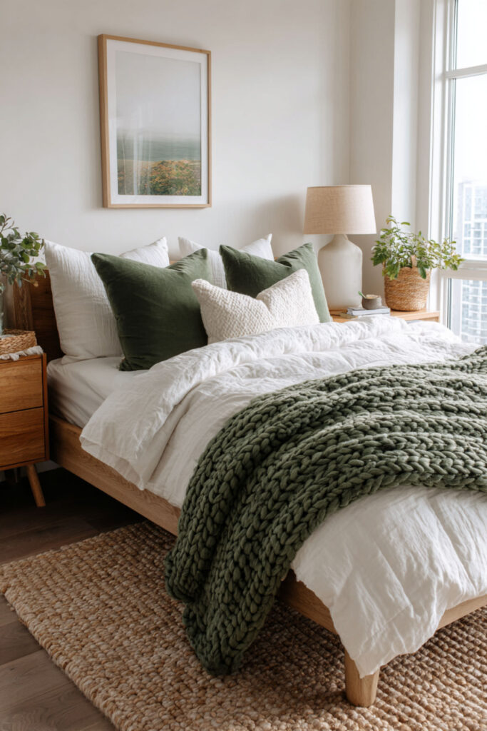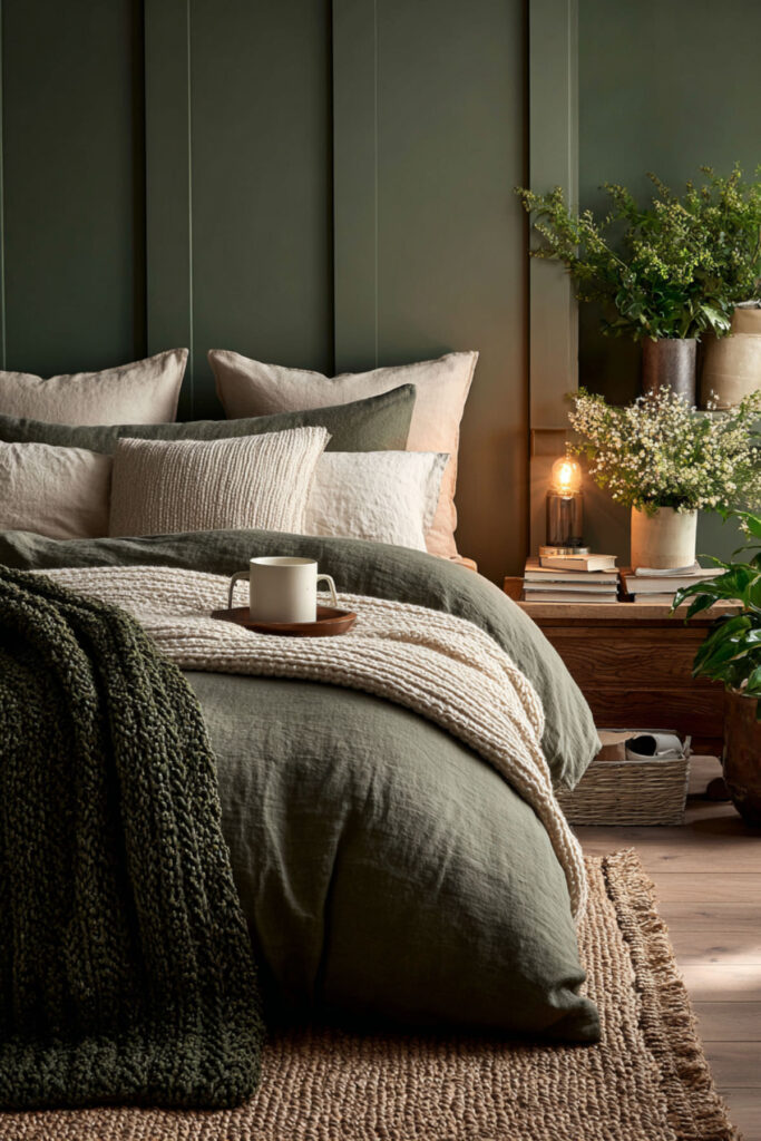 Cozy Forest Green Bedding with Layered Neutrals