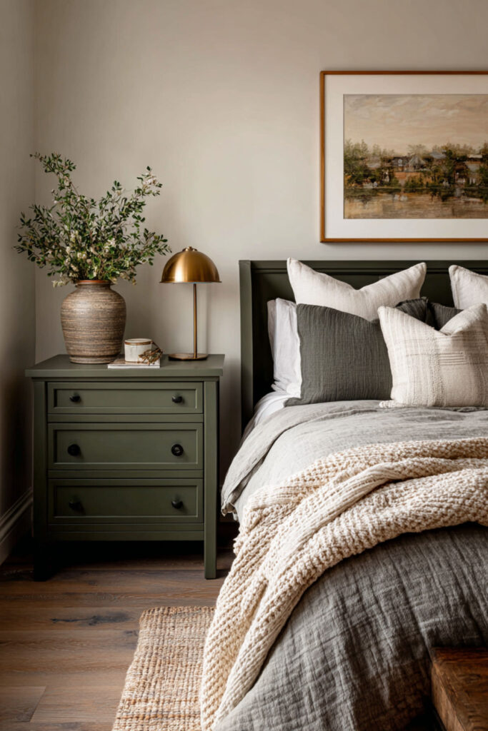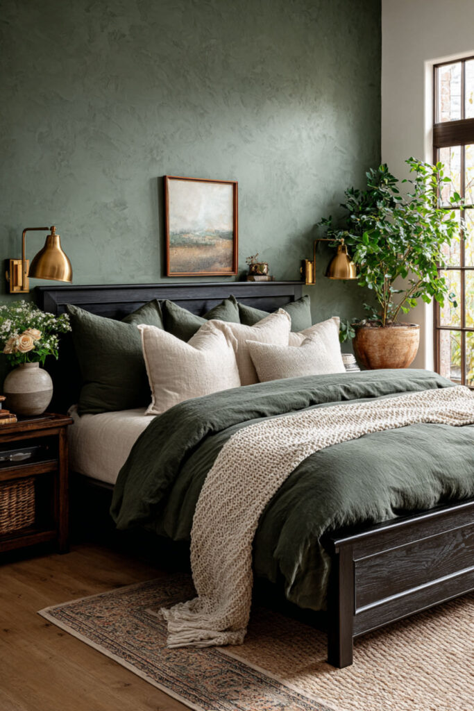 Moss green is a shade that doesn’t get nearly enough attention. It’s softer than forest green but warmer than sage, and it has this earthy, lived-in quality that makes a room feel like it’s been cozy forever. For moms who want an earthy bedroom that doesn’t feel too dark, moss green hits the sweet spot. Layer it with organic cotton bedding, a jute rug, and linen curtains in a raw, unbleached tone. I recommend a mossy green bedroom throw pillow set in different textures — velvet, linen, maybe even a cable knit. The variation in texture makes the monochrome palette feel rich instead of flat. Add a few dried eucalyptus stems in a simple vase and the room starts to smell as good as it looks.