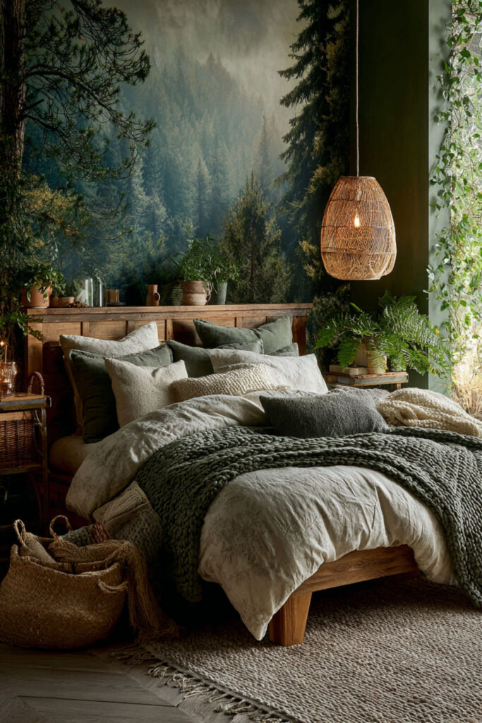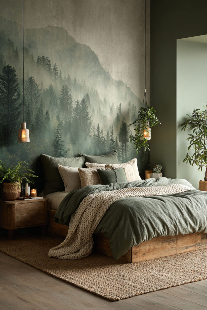 Would you ever try a full mural in a bedroom? I think it’s worth it — especially a woodland mural with misty trees and muted green tones. It sounds bold, but when you pick a design with soft, watercolor-style imagery instead of something photorealistic, the result is surprisingly dreamy and restful. This is one of those forest inspired bedroom decor ideas that’s been picking up steam, and it fits perfectly for a room where you want to feel transported. I recommend a peel-and-stick mural for easy commitment — you can swap it out down the road without damaging walls. Position it behind the bed, and keep the rest of the room simple: white or linen bedding, minimal furniture, maybe a single trailing plant on the nightstand. It’s like sleeping in the Pacific Northwest without leaving your house.
