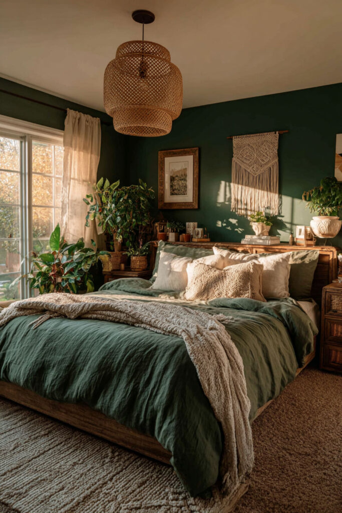 Boho and forest green were basically made for each other. The earthy, laid-back vibe of a boho bedroom gets a grounding anchor when you introduce deep greens into the mix. Think a forest green throw draped over a rattan bed frame, or moss green cushions scattered against woven textures. I recommend a large rattan headboard if you can find one — it adds visual warmth and pairs beautifully with green bedding. Toss in a couple of macramé wall hangings in cream or off-white, maybe a potted fiddle leaf fig in the corner. This forest green boho bedroom vibe is perfect for moms who want something relaxed but still intentional. The layered textures give your eyes plenty to look at, which honestly makes it so much easier to stay off your phone when you’re in bed.