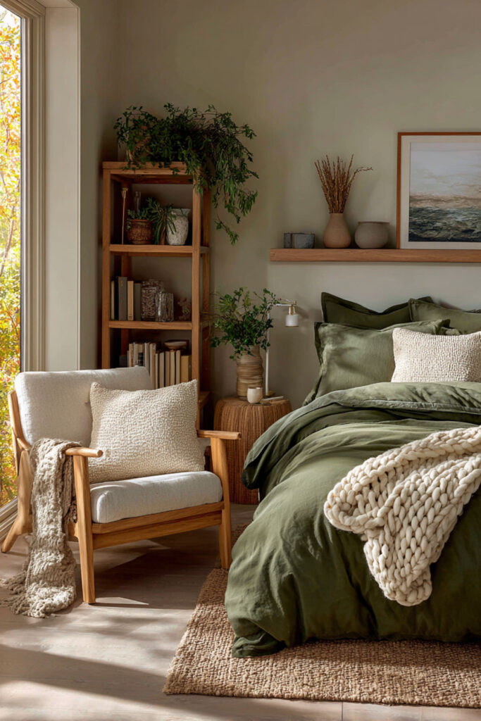 If screen-free evenings are the goal, a reading nook is pretty much the ultimate feature. And a neutral and forest green bedroom is the ideal backdrop for it. Carve out a corner with a cozy armchair in a soft ivory or oatmeal tone, toss a forest green knit blanket over the arm, and add a small side table with a reading lamp. That’s it. That’s the whole setup, and it changes everything. I recommend a bouclé or sherpa accent chair for this — something you actually want to sink into. The key is making the nook feel separate from the bed, like it has its own purpose. When you have a dedicated spot for winding down without a screen, your brain starts associating that corner with rest and quiet. Green bedroom decor ideas like this work because they’re functional, not just pretty.
