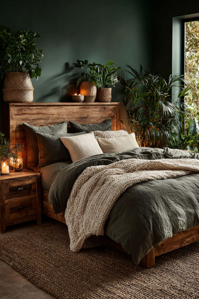 Okay, I used to think matching dark wood with dark green would make a room feel like a cave. I’ve totally changed my mind. When done right, forest green and dark wood together create this moody, grounded warmth that feels like a cabin in Vermont — minus the freezing temperatures. A walnut or espresso-toned nightstand next to forest green walls looks rich without being heavy. I recommend a nightstand with an open shelf so you can stack a couple of books and a candle — the things you actually want within arm’s reach during screen-free wind-down time. The combination of dark green and wood is one of the biggest moves in nature-inspired bedroom decor right now, and it works whether your style leans rustic or modern.
