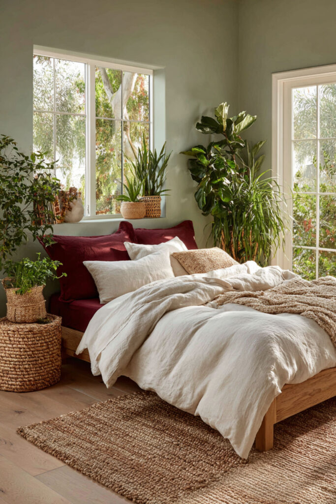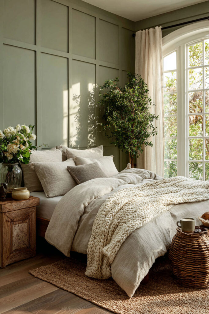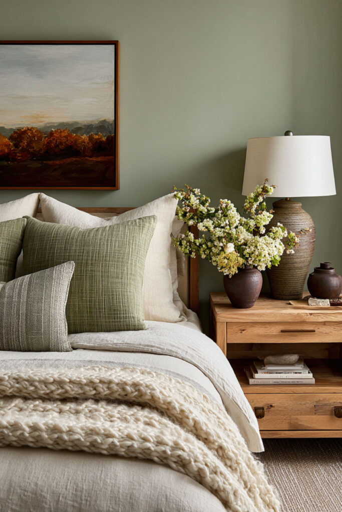 Combine green and wood bedroom elements for natural temperature balance. Pair sage walls with furniture and natural linen in cream. Wood adds warmth when hot flashes suddenly switch to chills – a common menopause surprise. The natural materials breathe better than synthetics during night sweats.
