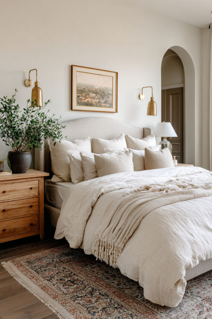 Combine green and cream bedroom elements for soft contrast that doesn’t jar sensitive systems. Pair sage walls with cream furniture and bedding, adding green accents thoughtfully. Cream prevents green from feeling cold when chills follow hot flashes. The combination provides options for rapidly changing needs.
