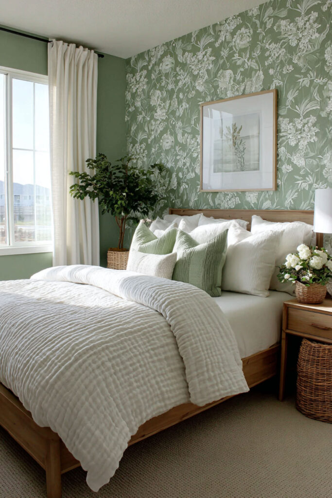 Add green wallpaper bedroom features for pattern distraction during hot flash discomfort. Think about a subtle botanical print in muted greens on one wall. Gentle patterns provide focal points during uncomfortable episodes.