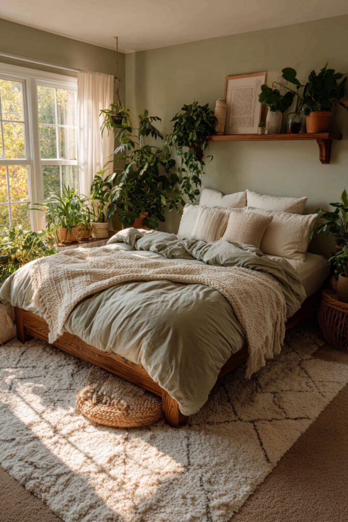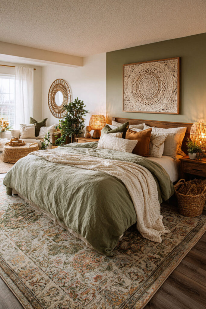 Layer bohemian bedroom decor over green walls for ultimate creative freedom. Add macramé wall hangings, vintage rugs, and eclectic furniture against forest green walls. This boho approach celebrates unconventional thinking. The layered textures inspire tactile creativity. Bohemian style gives permission for rule-breaking innovation.