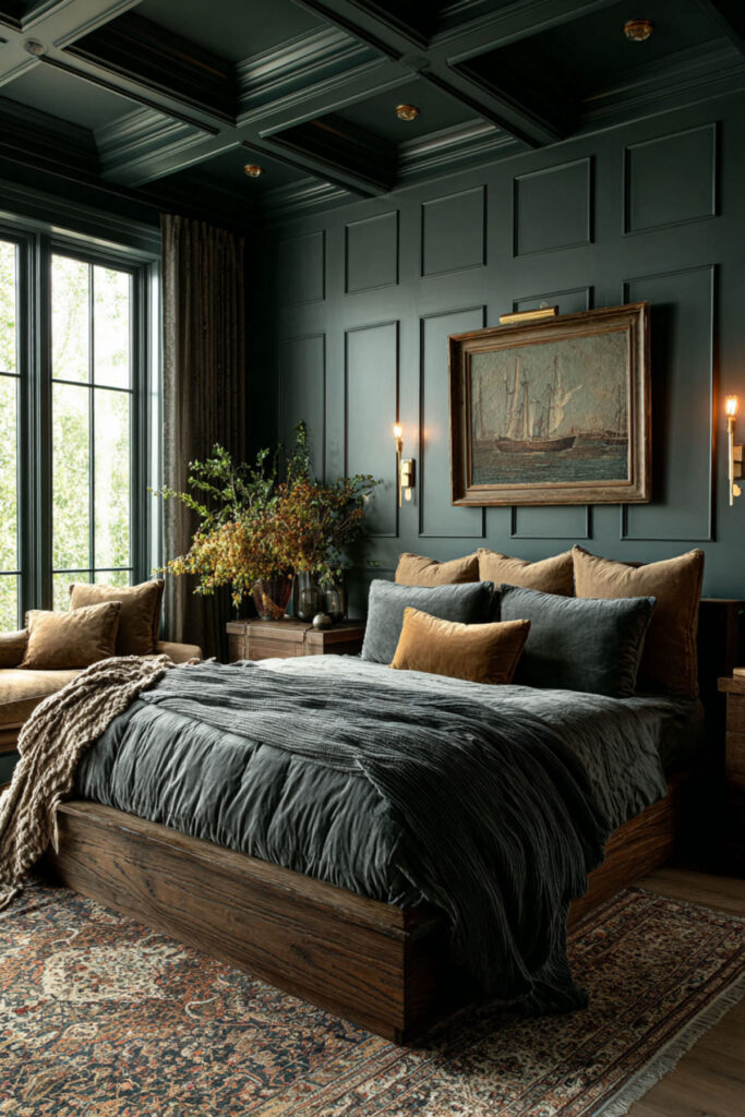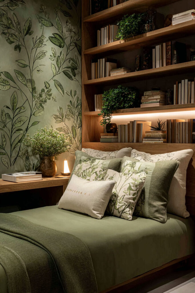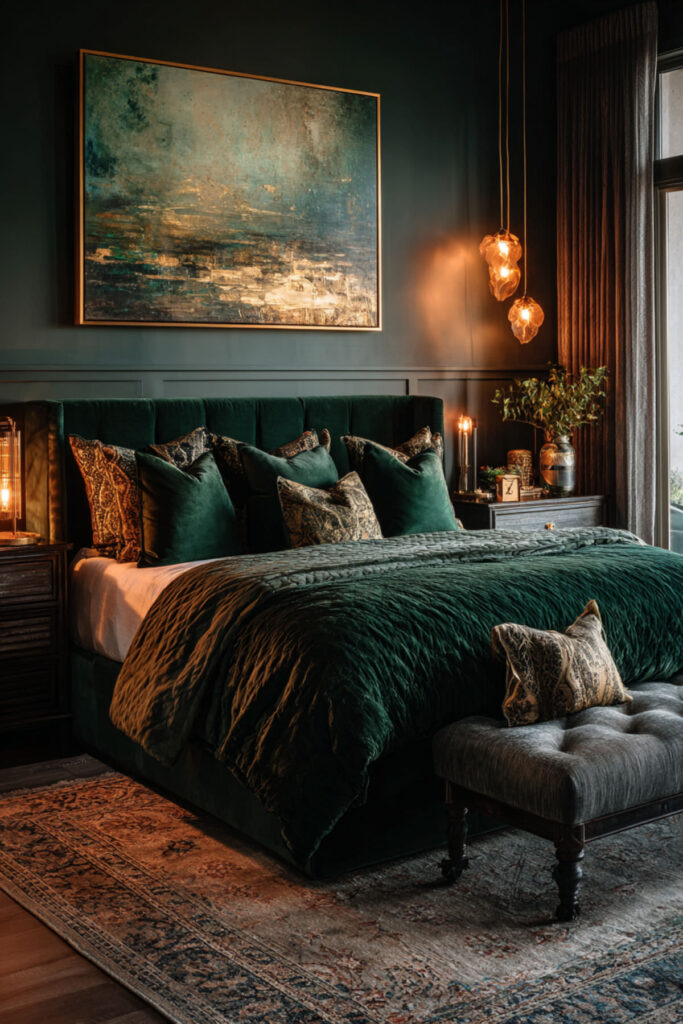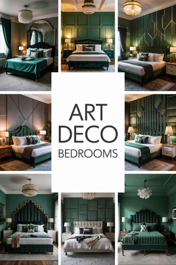 Create an art deco bedroom with deep green for bold, theatrical dreamers. Incorporate geometric patterns, metallic accents, and dramatic lighting against emerald walls. This glamorous approach makes creativity feel important and celebrated. Art deco’s boldness matches big dream energy. The style teaches that creativity deserves beautiful presentation.