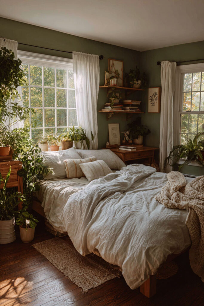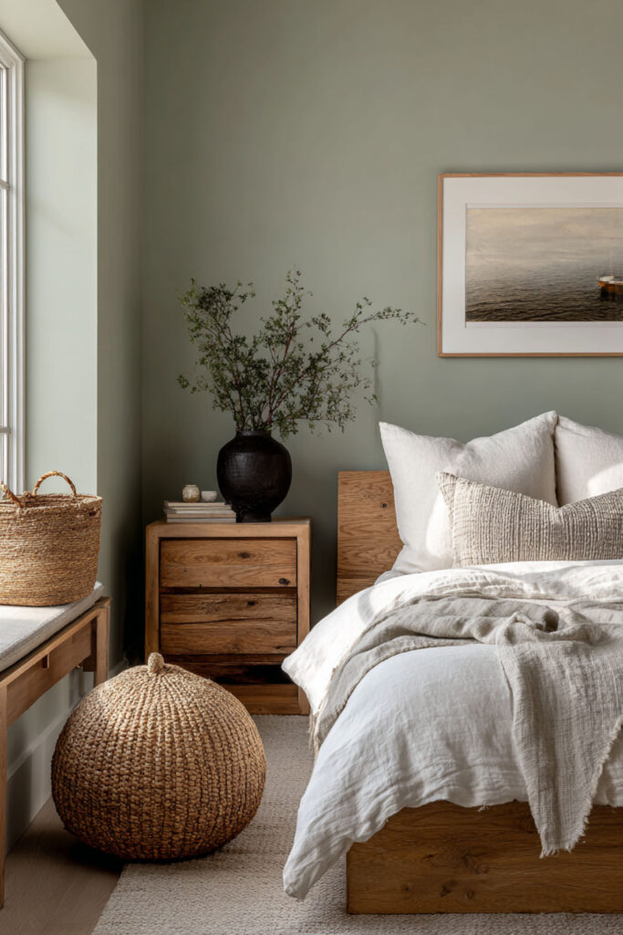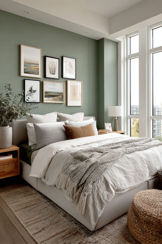 Choose sage green bedroom tones for gentle creative souls who dream quietly. How about a soft sage that whispers rather than shouts, great for introverted creators. This gentler green still supports big dreams without overwhelming. Sage provides thinking space for processing big ideas. The softness suits sensitive creative temperaments.