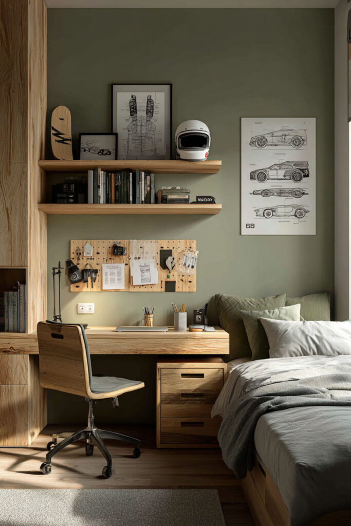 Design a green boys bedroom that supports creative dreams beyond typical themes. Think about a deep green inventor’s workshop with pegboards, project tables, and inspiration libraries. A sturdy adjustable-height project table anchors the room, providing a versatile surface for building, tinkering, and experimenting. This approach shows boys their creative dreams matter.