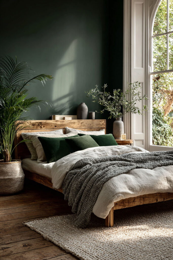 Design an organic modern bedroom green space that balances wild dreams with peaceful process. Combine deep green walls with simple wood furniture, minimal decor, and quality materials. This approach provides calm structure for chaotic creativity. Modern simplicity prevents overwhelming sensitive creators. The organic elements keep the space grounded and real.