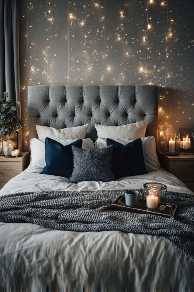 Use fairy lights to create a faux headboard by arranging them in geometric patterns on the wall.