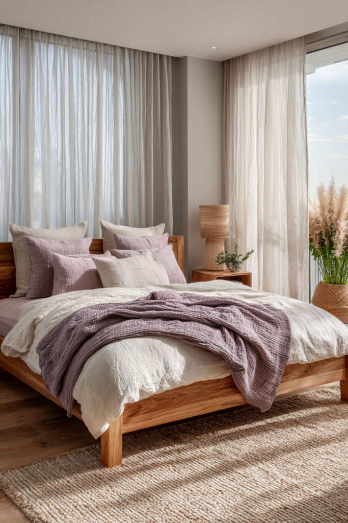 How light enters your bedroom in the morning matters more than most people think. Harsh, direct sunlight can feel aggressive first thing. Sheer white curtains filter that light into this gorgeous, soft glow that fills the room without blinding you. I recommend floor-length sheer linen curtain panels in warm white, hung on a simple pale wood or matte brass rod. The fabric diffuses the light beautifully and keeps the room feeling airy and open. Against lavender walls, the effect is almost ethereal — like waking up inside a soft cloud. This is one of those neutral bedroom decor touches that does so much heavy lifting with so little effort.