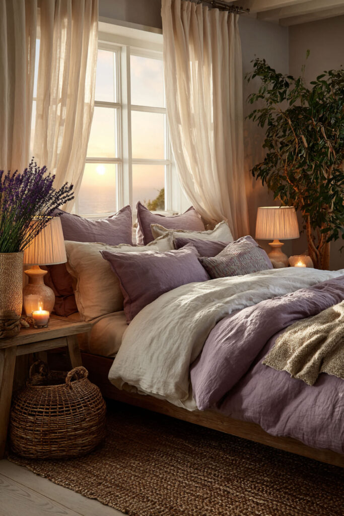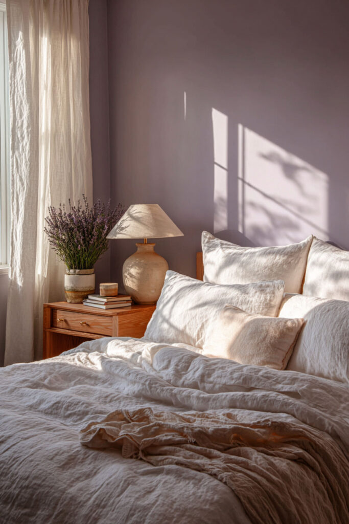 Keep the bedding clean and bright. Crisp white linen sheets and a white duvet create this fresh, airy foundation that catches morning light beautifully. Then add a single lavender throw, folded at the foot of the bed, to tie the palette together without overcomplicating things. I recommend a pre-washed white linen duvet cover with matching pillowcases and a lightweight cotton throw in a muted lavender. The white-on-lavender contrast is clean and modern, and the linen texture keeps it from looking too hotel-like. It’s simple bedroom decor at its most refined — the kind of bed you actually want to make every morning because it looks so good when it’s done.