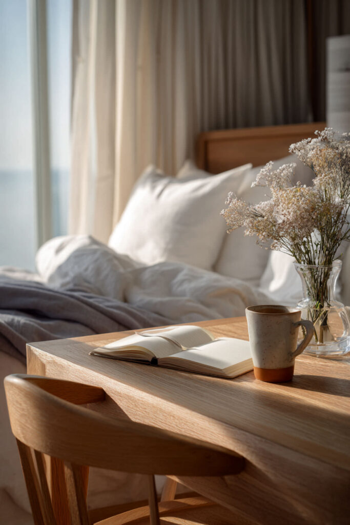 This one’s specifically for the women who want their mornings to mean something. A small desk or table in pale oak, placed near a window where natural light comes in, creates a dedicated spot for journaling, planning, or just sitting quietly with your thoughts before the day starts. I highly recommend a slim writing desk in light oak with a simple chair or stool. Add a linen-bound journal in lavender, a ceramic pen cup, and a small candle. That’s it. No phone dock, no laptop station — this isn’t a workspace. It’s a thinking space. A morning inner sanctum where the only agenda is yours. Think of those quiet desk nooks you see in Scandinavian apartments — intentional, bright, and designed for one thing: presence.