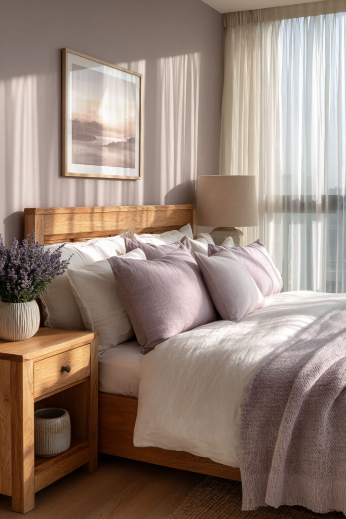 That’s exactly what lavender and pale oak do together. Lavender has this quiet, clarifying energy — it’s soft without being childish, calming without being boring. Pale oak adds warmth, structure, and this beautiful sense of natural order. Together, they make a bedroom that feels like a deep breath. The kind of room where journaling before breakfast actually sounds appealing instead of aspirational.