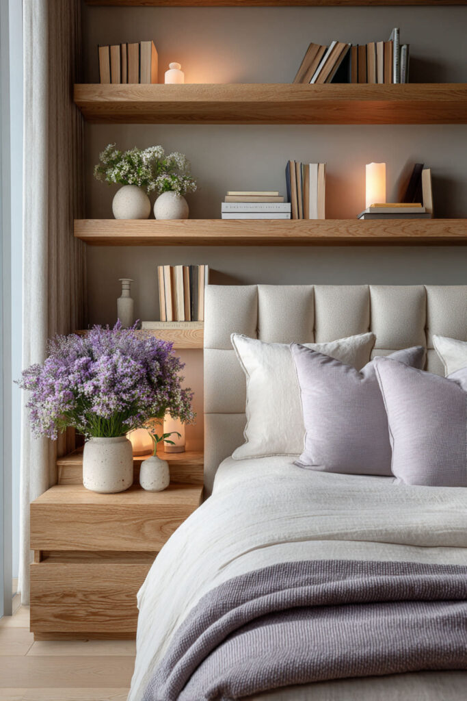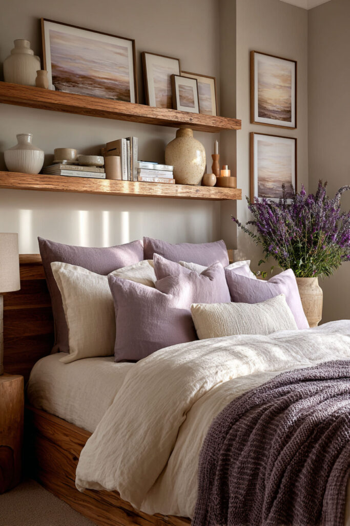 I came across this idea trending on Pinterest and I think it’s one of the most understated, beautiful touches you can add. A small handmade ceramic vase in a soft lavender or cream glaze, holding a single dried stem or a sprig of fresh eucalyptus, adds organic beauty without any visual clutter. I recommend a matte ceramic vase in a muted lavender tone, placed on the nightstand or the floating shelf. It’s one piece doing one job — adding softness and life to the room. That’s it. Sometimes the smallest details are the most powerful, and this is the kind of natural bedroom decor moment that makes a space feel truly considered.