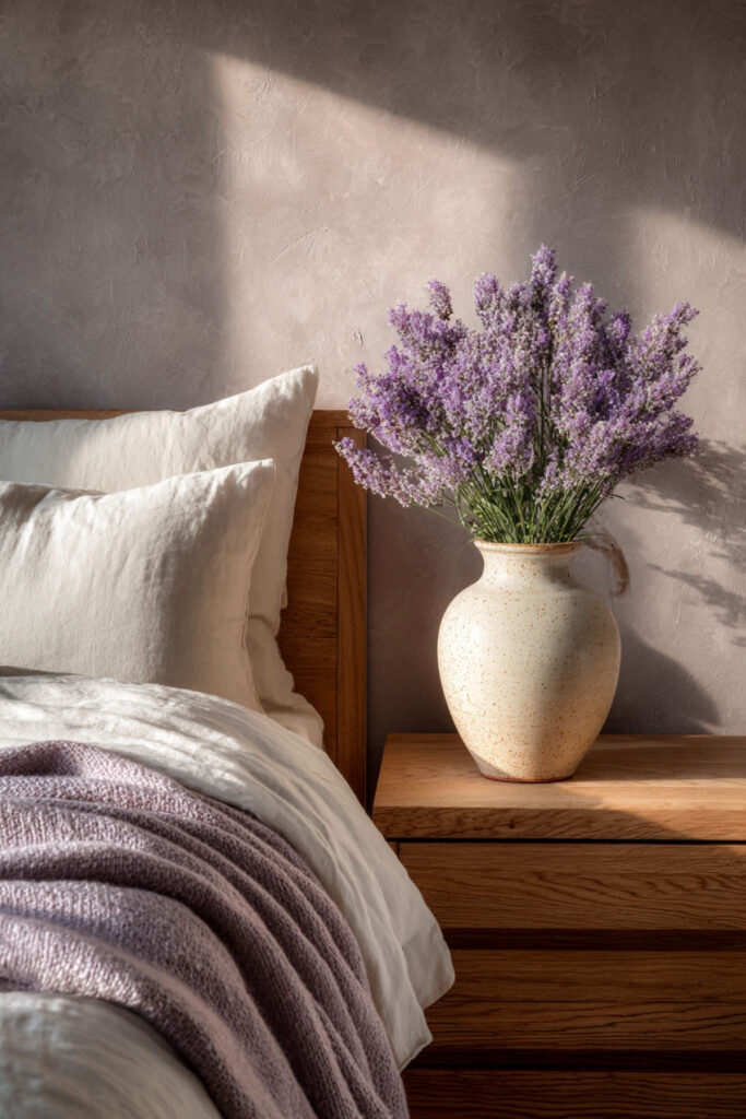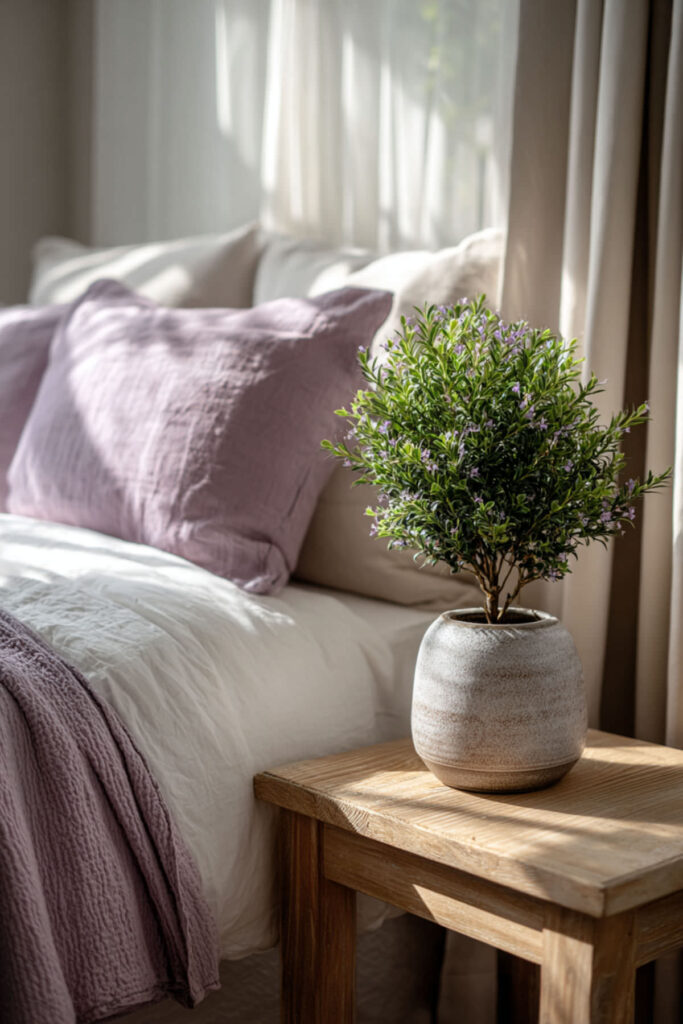 A single plant in a cream or white pot brings a quiet breath of life into a lavender and oak room. Something small and low-maintenance — a trailing pothos, a tiny fern, or a rosemary sprig in a clay pot — adds just enough green to keep the room feeling fresh and alive. I recommend a small ceramic planter in matte white with a simple plant you won’t stress about keeping alive. Place it on the nightstand, the windowsill, or the floating shelf. It’s one of those cozy bedroom decor details that makes a huge difference in how the room feels in the morning — alive, fresh, and ready for the day.