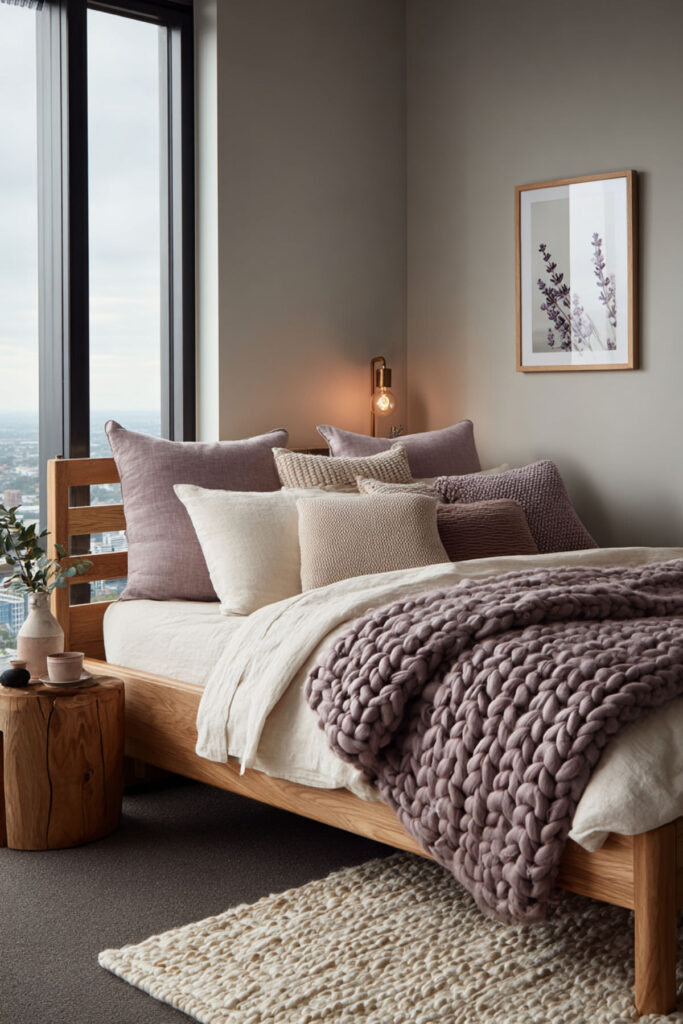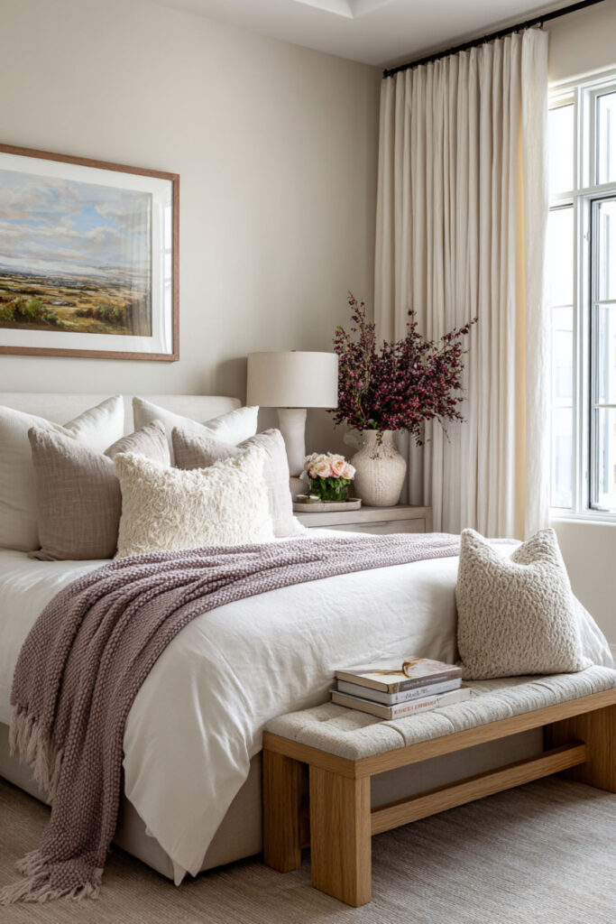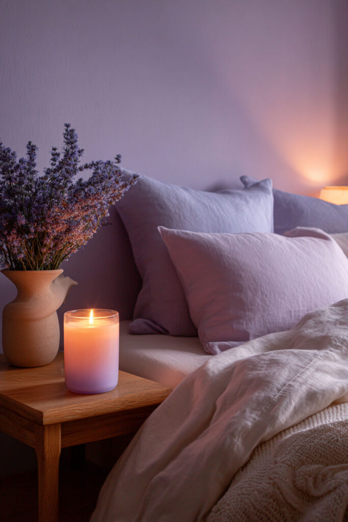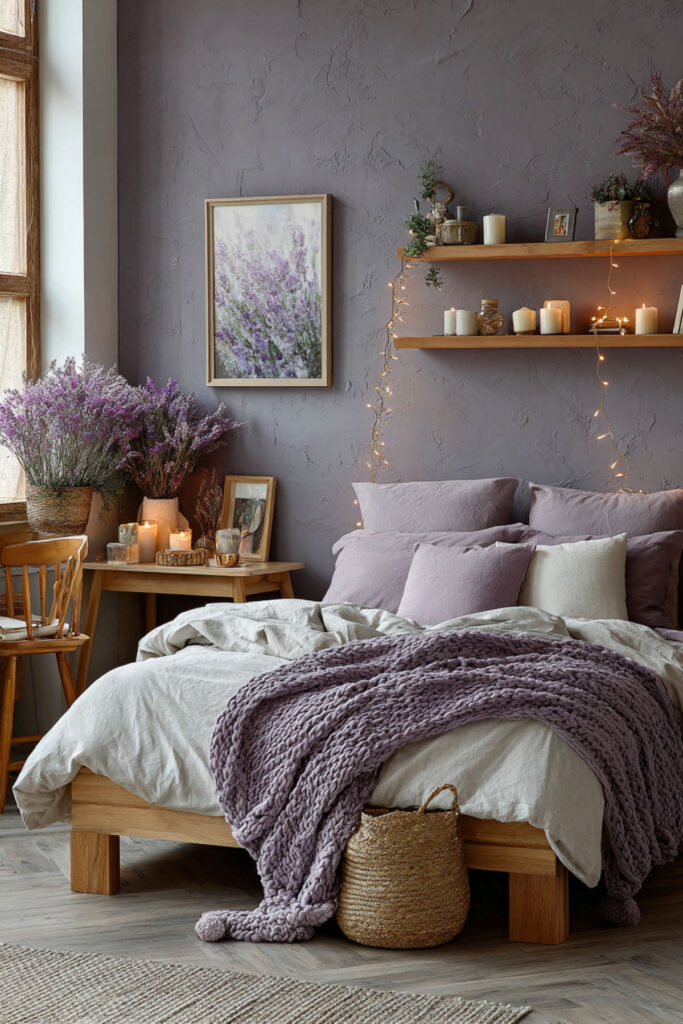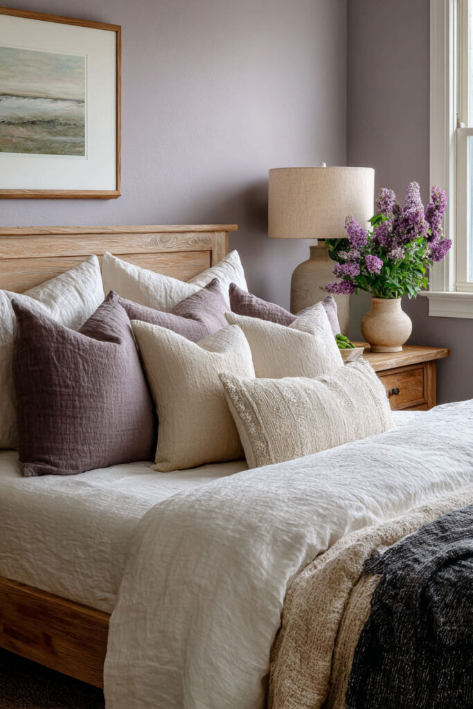 A few well-chosen throw pillows in the lavender family — a muted lilac linen, a soft mauve velvet, a cream knit — give the bed just enough layered softness without overwhelming it. The key is texture variety within a tight color range. I recommend three to four throw pillows in tonal lavender and cream shades, each in a different fabric. It creates that bedroom goals look that’s all over Pinterest right now — soft, curated, and effortlessly pretty. Keep them to a reasonable number. This isn’t about pillow mountains. It’s about just enough softness to make the bed look inviting and the room feel complete.
