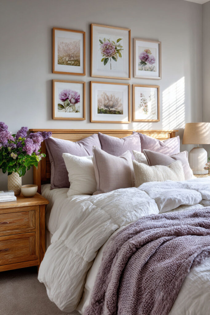 Instead of a big gallery wall, try two or three art prints in pale oak frames hung in a clean row or small cluster. Choose pieces in soft, muted tones — abstract watercolors, line drawings, botanical sketches — that complement the lavender without competing with it. I recommend frames in natural oak with a minimal profile, holding prints that feel calm and intentional. These are bedroom decor ideas for women who want their walls to feel considered, not covered. The pale wood ties back to the furniture while the art adds a quiet layer of personality. Understated and beautiful — that’s the whole goal.