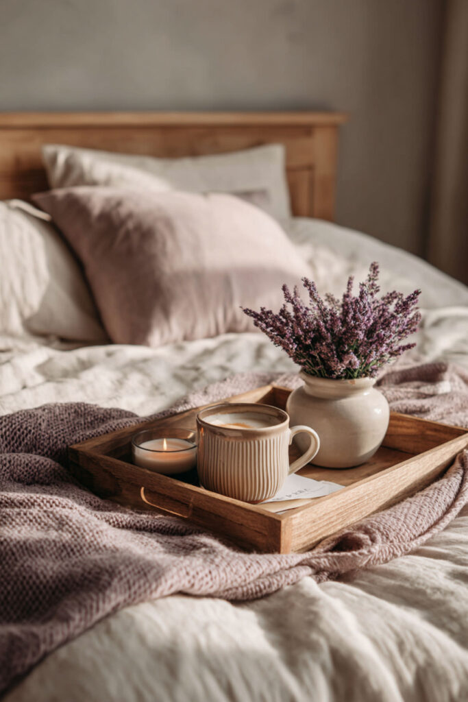 The morning routine starts with the night before. A lavender-scented soy candle on the nightstand or a small tray helps signal to your body that it’s time to shift gears. The soft light and gentle scent create a sensory cue that says: we’re done working. We’re entering rest mode. I recommend a hand-poured soy candle in a ceramic or glass vessel with a light lavender scent — not overpowering, just barely there. Light it thirty minutes before bed as part of your wind-down. This is bedroom retreat energy at its simplest — a ritual that costs almost nothing, takes almost no effort, and genuinely supports better sleep. Which means better mornings.