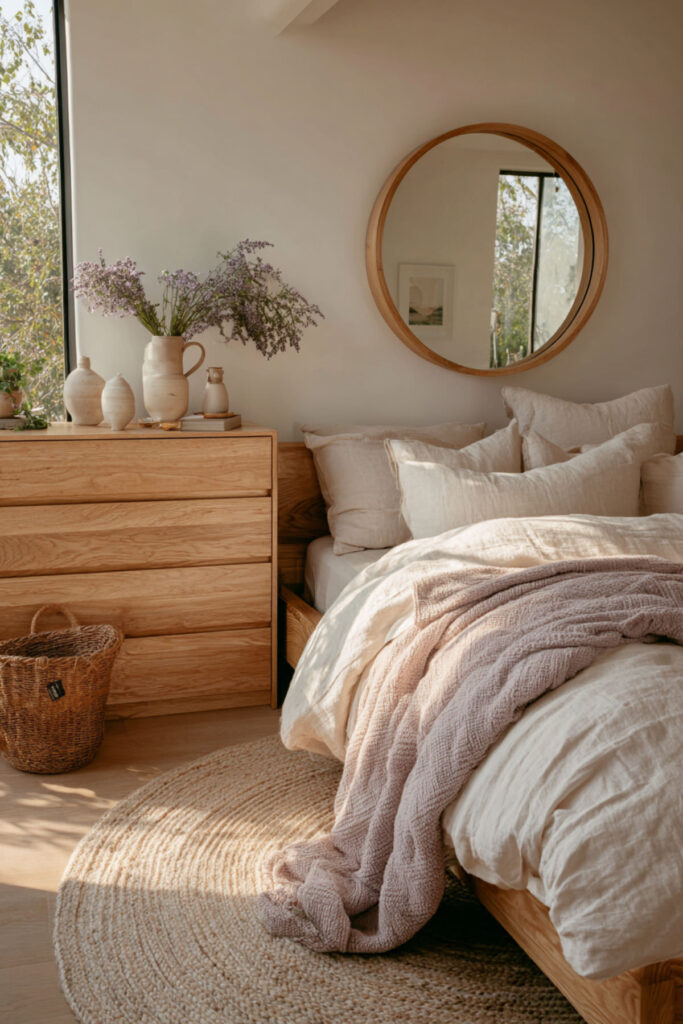A round mirror in a pale oak or light wood frame bounces light around the room and makes even a small space feel more open and bright. Hung above a dresser or leaned against the wall, it doubles as both functional piece and modern bedroom decor. I recommend a 24–30 inch round mirror with a slim, natural wood frame. The organic shape softens the straight lines of the furniture, and the light wood keeps everything cohesive. It’s the kind of detail you’d spot in a well-designed room and not immediately pinpoint why it works — but it does. It adds warmth, light, and a sense of completeness.