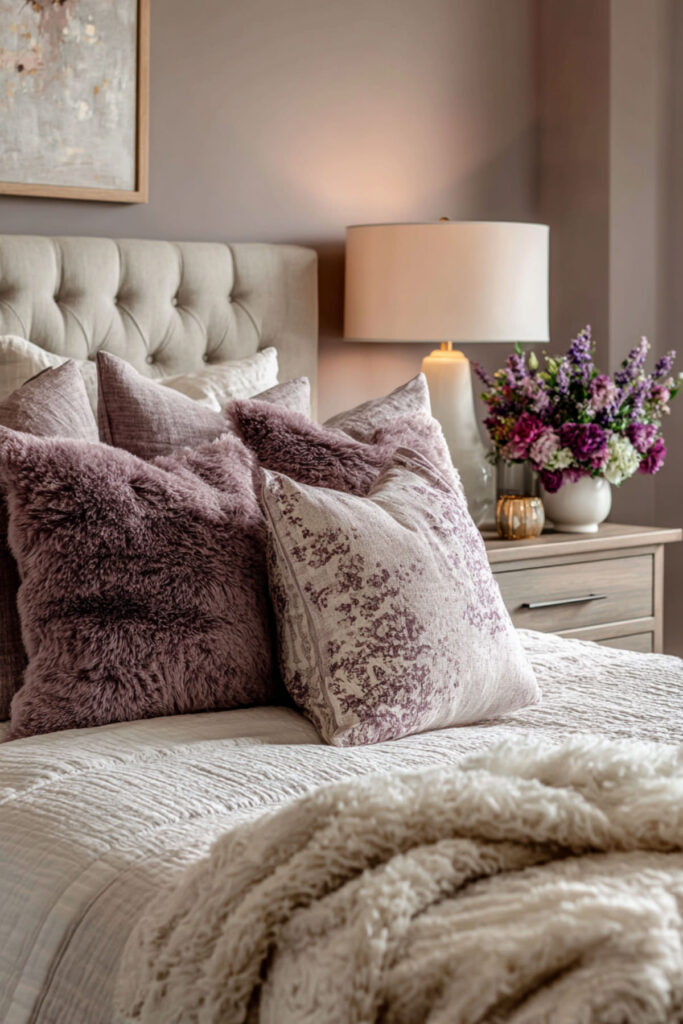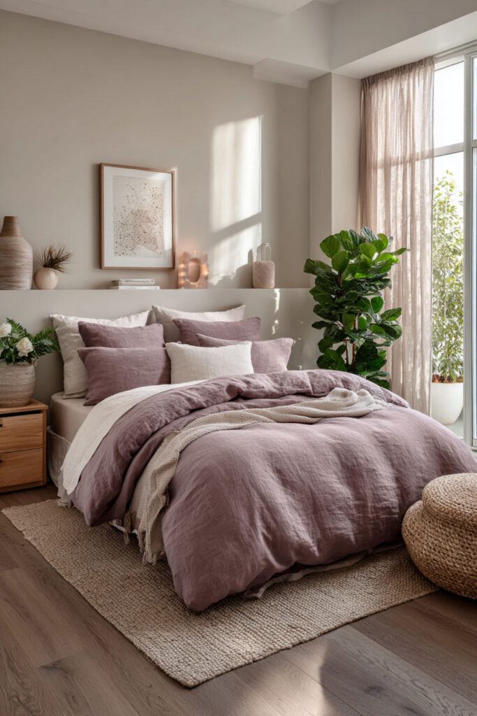 I strongly recommend a mauve comforter or duvet cover in a washed linen or cotton texture — the softness of the fabric reinforces the emotional tone of the color. Layer it with cream or ivory pillowcases, a dusty rose or blush pink throw, and one or two pillows in a deeper plum or grey-mauve tone. The layering creates depth without complexity, which is exactly the quality a bedroom designed for rest and restoration should have.