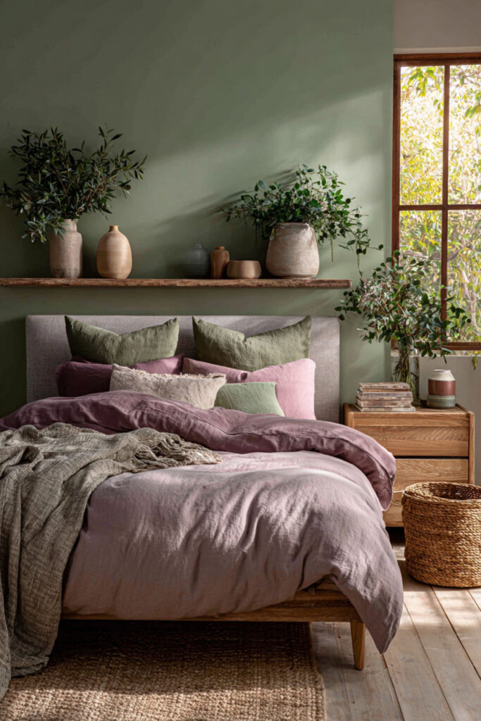 This one surprises people every time. Sage green and mauve shouldn’t work as well as it does — and yet the combination is consistently one of the most beautiful things in bedroom design right now. The green and the mauve sit on opposite sides of the colour wheel in a way that creates natural tension, but both tones are muted enough that the tension reads as interest rather than clash.