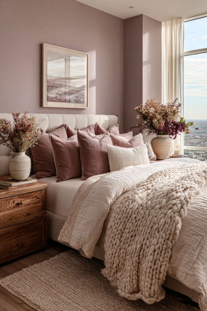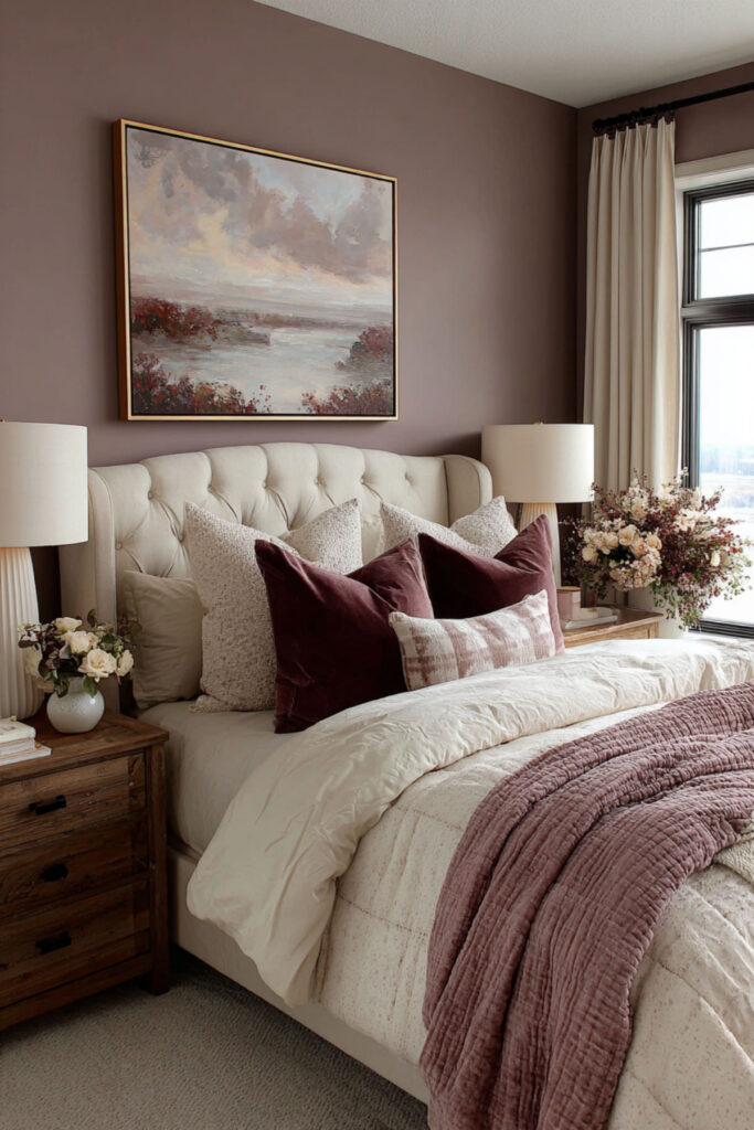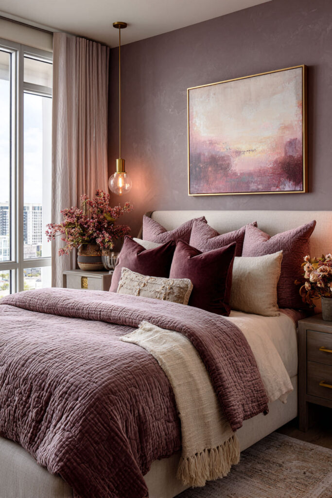 Think mauve walls with a plum velvet headboard, plum throw pillows, or even a plum-toned throw at the foot of the bed. The contrast between the softer mauve and the deeper plum creates a layered, jewel-toned quality that works especially well in the evening with warm lighting. I strongly recommend a plum velvet throw pillow as the anchor for this palette — it’s a single piece that immediately deepens the whole room’s mood.