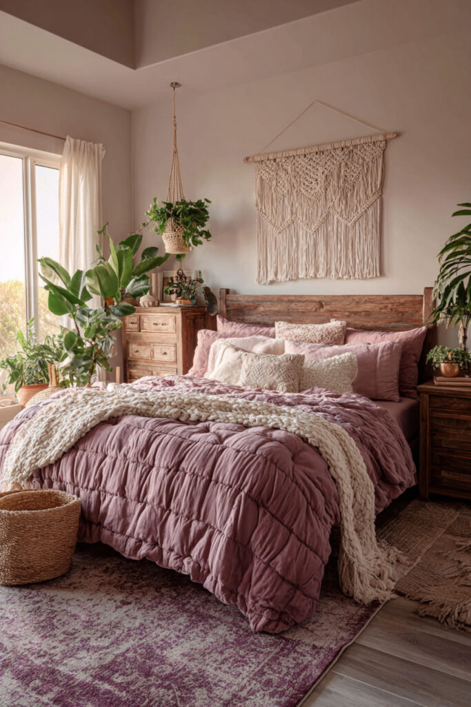 The bohemian version of a mauve bedroom is the one that leans into texture rather than pattern — layered textiles in mauve, blush, dusty rose, and cream, mixed across different weaves and fabrics. A macramé wall hanging in natural fibre, a woven throw in a slightly deeper mauve, a rattan or cane headboard, a jute rug underfoot. Each element is from a different tradition but shares the same earthy, soft quality.