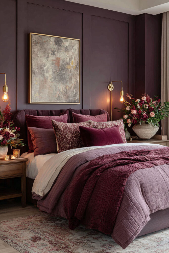 For a mauve bedroom that skews darker and more dramatic, introducing plum as a deeper accent takes the palette somewhere genuinely interesting. Plum and mauve share the same purple-pink colour family but plum brings depth and richness that keeps the room from feeling too soft or too pastel. It’s the version of the mauve bedroom that reads as confidently feminine rather than delicately so.