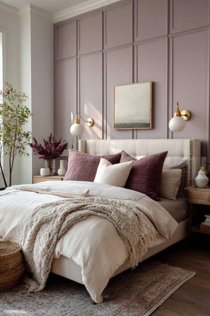 Mauve wall panelling — board and batten, picture rail moulding, or simple flat panel detailing — is one of the most satisfying ways to use this colour in a bedroom. The panelling adds architectural detail that makes the mauve feel considered rather than just painted. The colour fills in between the lines (literally) and the texture of the moulding creates shadow and depth that flat walls can’t achieve.