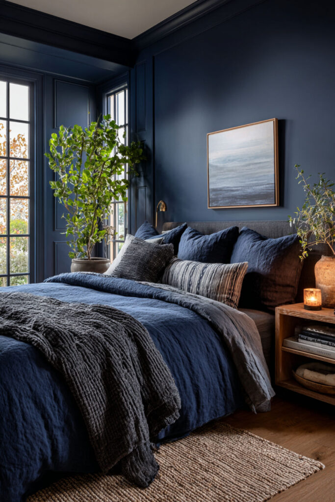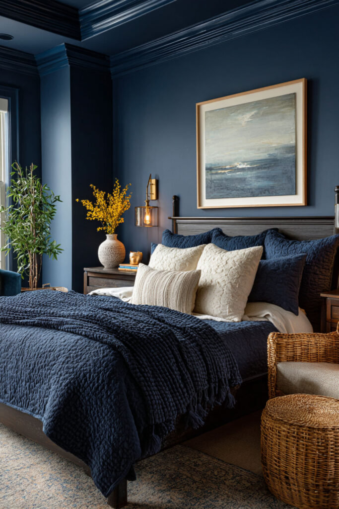 Four walls of midnight blue creates the full cocooning effect — the room becomes a single deep, saturated environment that absorbs light and wraps you in color from every direction. This isn’t subtle and it’s not trying to be. Full immersion in midnight blue produces a bedroom that feels like the inside of a velvet-lined box: intimate, private, and emotionally quiet. Matte finish is essential — it diffuses light and hides imperfections, amplifying the cocoon-like quality that satin or gloss would undercut with shine. I recommend midnight blue interior wall paint in matte finish on all four walls and the ceiling if you want the full color-drench effect. This dark blue bedroom and dark blue bedrooms idea is the foundation for everything — the room where depth isn’t an accent. It’s the entire point.