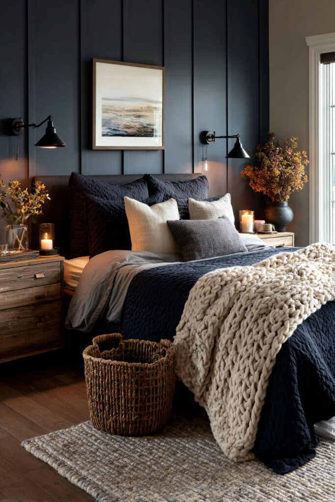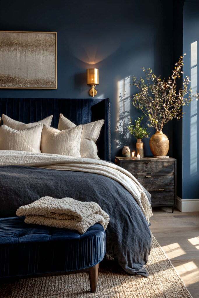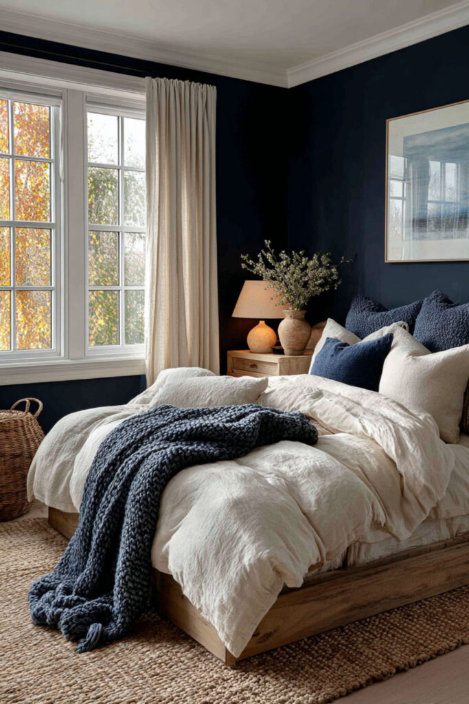 Here’s the thing about moody interiors that some people get wrong: they think dark walls mean dark everything. In reality, dark rooms need contrast to keep the depth visible. Cream and warm white bedding against midnight blue walls creates the luminous focal point that makes the bed glow and prevents the room from collapsing into a single flat dark mass. The light bedding catches every bit of ambient light and reflects it softly against the dark walls. I recommend a cream or ivory duvet cover with warm white sheets, a slightly warmer throw at the foot, and two to three accent pillows in cream, charcoal, and one deep blue. This navy blue bedroom ideas and dark blue bedroom ideas colour schemes concept builds the bed as the room’s bright center — the surface that says “here is where rest happens” within all that depth.