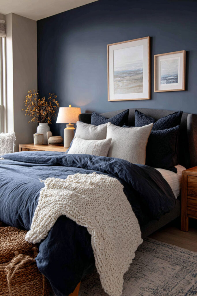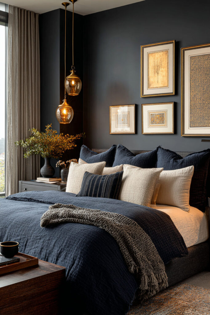 Art on dark walls has a presence that art on white walls doesn’t — the saturated background makes lighter artwork glow and gives every piece a sense of weight and importance. One or two larger pieces (rather than a scattered gallery wall) maintain the room’s clean, uncluttered energy while adding the visual personality that makes the space feel curated rather than uniform. Abstract work in warm tones (amber, cream, muted gold) creates a dialogue between the art and the metallic accents. I recommend one to two larger framed art pieces in warm-toned or complementary colors, mounted on the midnight blue or charcoal wall above the bed or on an adjacent wall. This navy blue bedroom ideas and dark blue bedroom aesthetic idea adds the curated element that transforms dark walls from a paint decision into a canvas — the depth that reveals what matters to you.