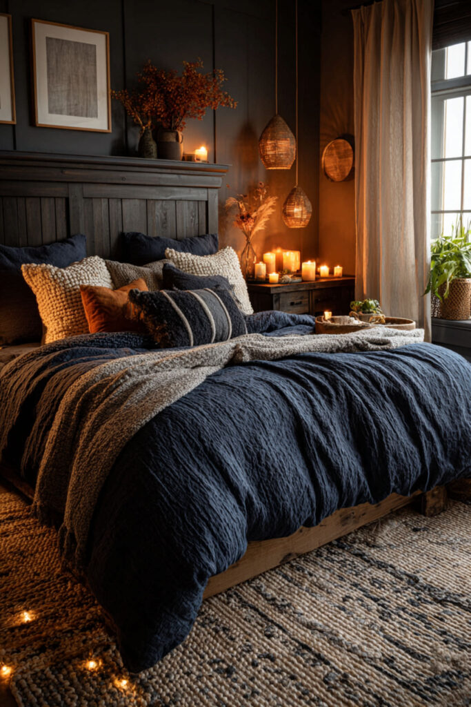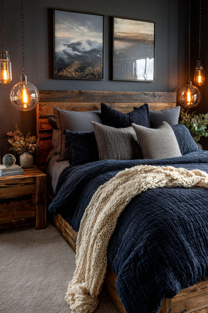 A charcoal accent wall behind the bed adds the darkest surface in the room directly behind the headboard, creating a visual anchor that grounds the bed against the midnight blue remaining walls. The charcoal reads as near-black in low light but reveals warm or cool undertones (depending on the specific shade) during the day, adding depth that shifts with conditions. This two-dark-tone approach gives the room tonal variation without introducing any brightness — it stays moody throughout. I recommend charcoal matte wall paint on the wall behind the bed, with midnight blue on the remaining three walls. This dark blue and grey bedroom and blue gray bedroom idea layers two dark tones for the room that feels like one continuous atmosphere of depth — no wall competes, every surface cooperates.