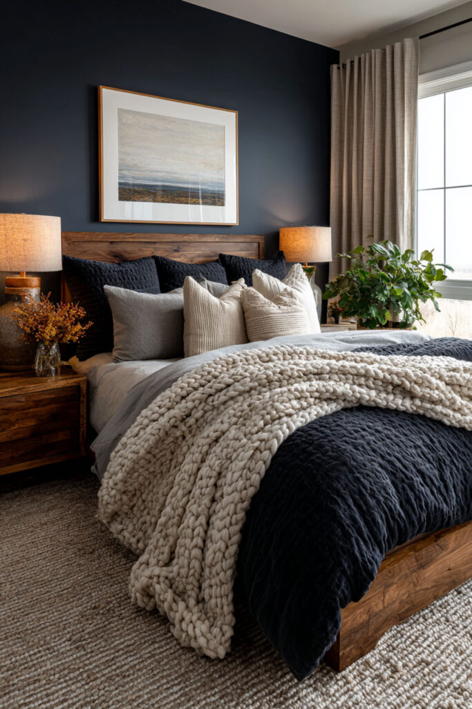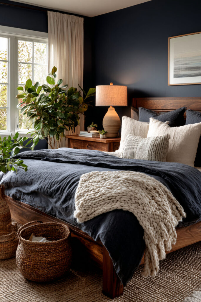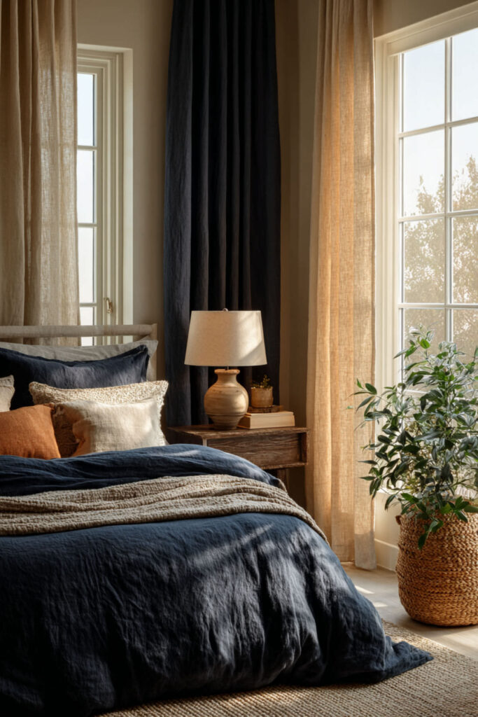If full charcoal-and-midnight feels like more darkness than you’re ready to live inside, warm beige softens the mood without losing the depth. Beige bedding, beige curtains, and beige textiles against midnight blue walls create a palette that reads as moody and rich but warmer and less severe. The beige carries enough warmth to offset the coolness of midnight blue, and the contrast is gentler — the room feels deep and enveloping but not heavy. I recommend midnight blue walls with warm beige duvet cover, beige or sand-toned curtains, and warm beige textiles. Bridge with cream pillows and one or two charcoal accents. This blue and beige bedroom and navy blue and beige bedroom idea gives you the moody depth without the full commitment to dark-on-dark — the version that feels like sinking into a warm, deep twilight.