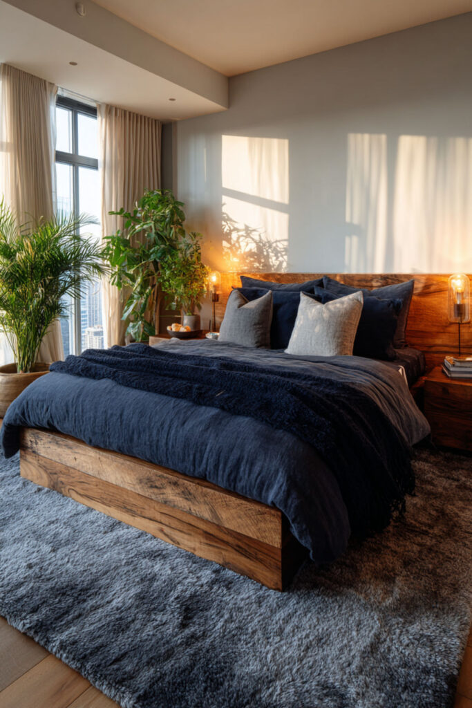 Dark wood — walnut, espresso-stained oak, dark ash — adds organic warmth and structure to a midnight blue room without introducing brightness. The wood grain creates natural pattern and texture that the painted walls lack, and the warmth of the wood prevents the room from feeling like it’s entirely made of paint and fabric. A solid wood bed frame with visible grain becomes the room’s grounding furniture piece, the structural center within all the softness. I recommend a solid dark wood bed frame (walnut or espresso-stained oak) with visible grain and clean lines. Platform or low-profile silhouettes keep the room modern. This dark blue bedroom and navy walls idea adds the organic, tactile weight that grounds the room — wood as the warm structural backbone within the moody palette.