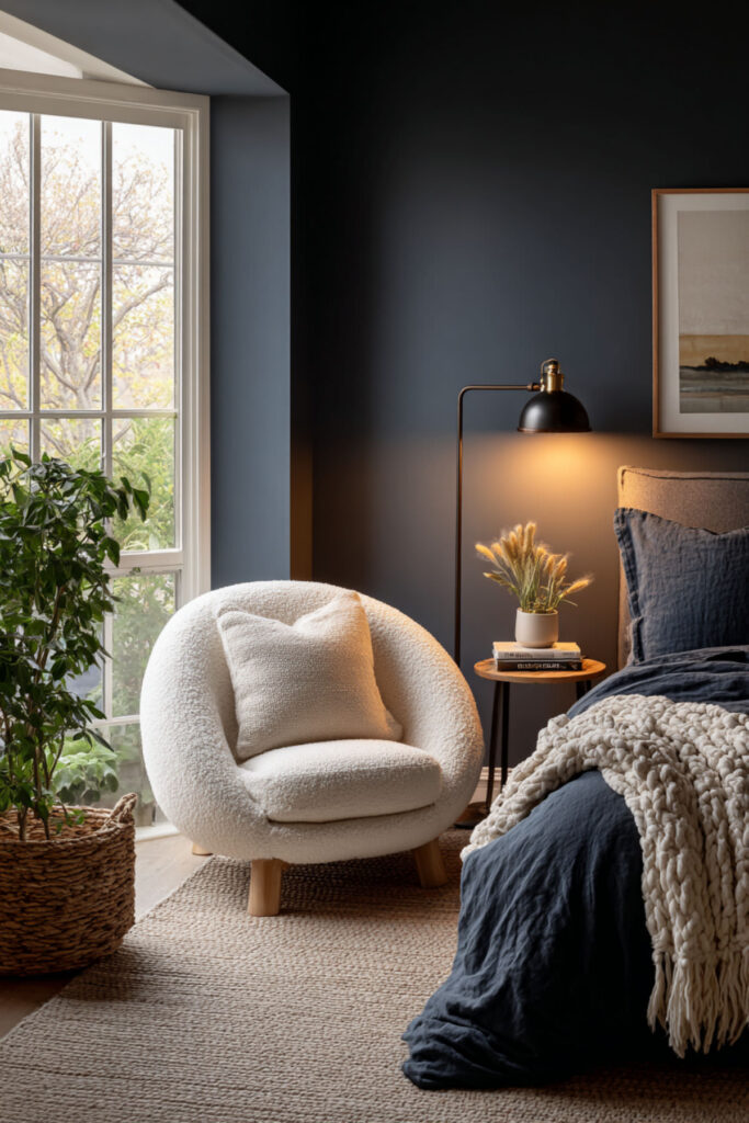 Every well-designed bedroom has a second zone — a place that isn’t the bed where sitting, reading, thinking, and simply being can happen. In a moody room, a comfortable armchair in cream linen (for contrast) or dark leather (for tonal consistency) creates this zone. Positioned near the window with a brass floor lamp and a small dark wood side table, the chair becomes the room’s ritual space. Dark leather (cognac, espresso, or deep brown) connects to the wood furniture and adds the masculine warmth that balances the room’s softness. I recommend a comfortable armchair in cream linen or dark leather, positioned near the window with a brass floor lamp and a dark wood side table. This dark blue bedroom ideas and smoky blue bedroom idea gives the room its second anchor — the zone where the moody atmosphere becomes active space rather than backdrop.