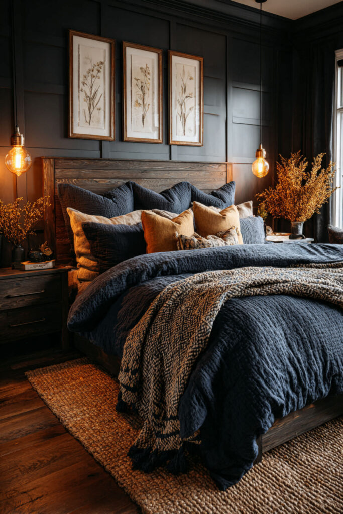 A large upholstered headboard in charcoal against a midnight blue wall creates a tonal anchor that defines the bed’s vertical space without introducing any brightness. The charcoal headboard absorbs into the dark wall in low light (making the bed feel like it’s emerging from the wall itself) and separates gently in daylight (adding visual definition to the room’s darkest zone). Linen or velvet upholstery adds the textural variation that keeps two dark surfaces from reading as flat. I recommend a large upholstered headboard in charcoal linen or charcoal velvet, mounted or positioned against the midnight blue wall behind the bed. This blue gray bedroom and dark blue and grey bedroom idea gives the bed its vertical structure within the moody palette — the surface where the charcoal and the blue meet.