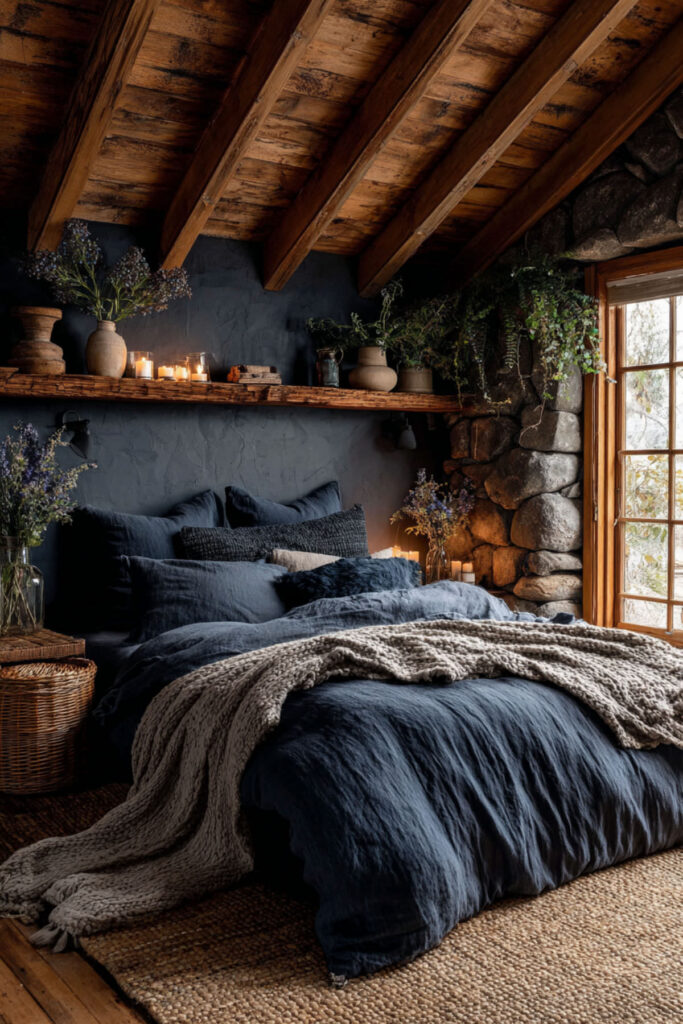 In a moody room, curtains serve a dual purpose: they filter light during the day (preventing the room from becoming completely dark when you want soft natural light) and they frame the window wall with texture. Linen in cream adds warmth and brightness to the window area. Linen in soft grey maintains the muted palette without introducing any lightness that feels inconsistent with the mood. Floor-length, hung at ceiling height, falling in relaxed folds — the linen’s organic texture connects the dark architectural surfaces (walls) to the soft surfaces (bedding). I recommend floor-length linen curtains in cream or soft grey, hung at ceiling height, with an optional blackout panel behind for complete darkness when needed. This dark blue bedroom walls and navy blue bedroom walls idea adds the one textile layer that controls light and gives the dark room its finished, intentional edge.