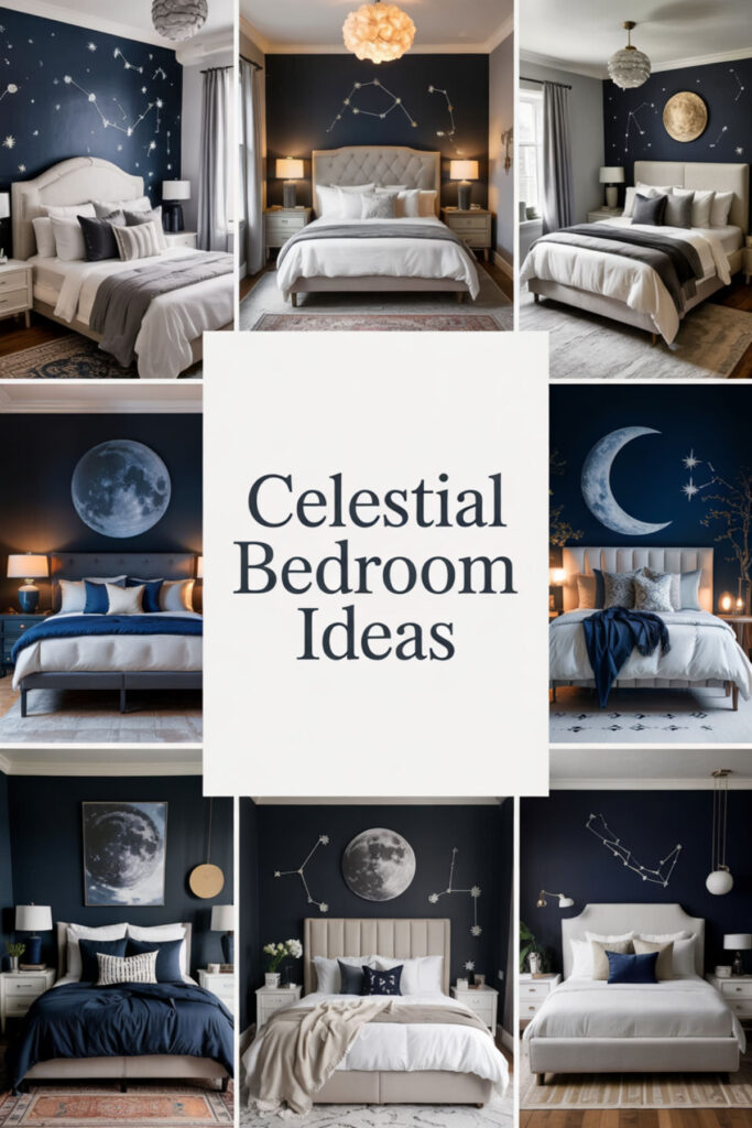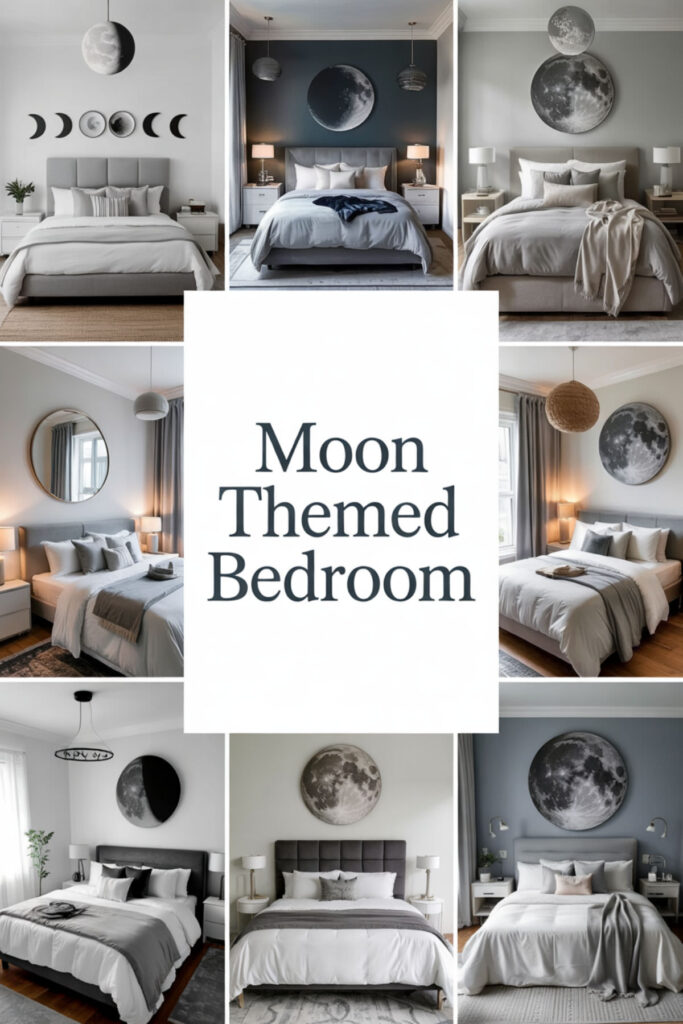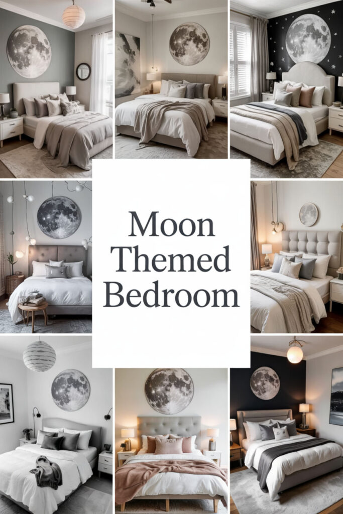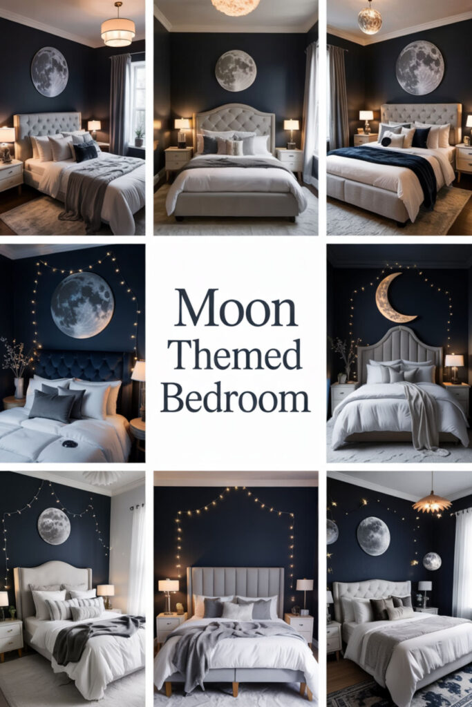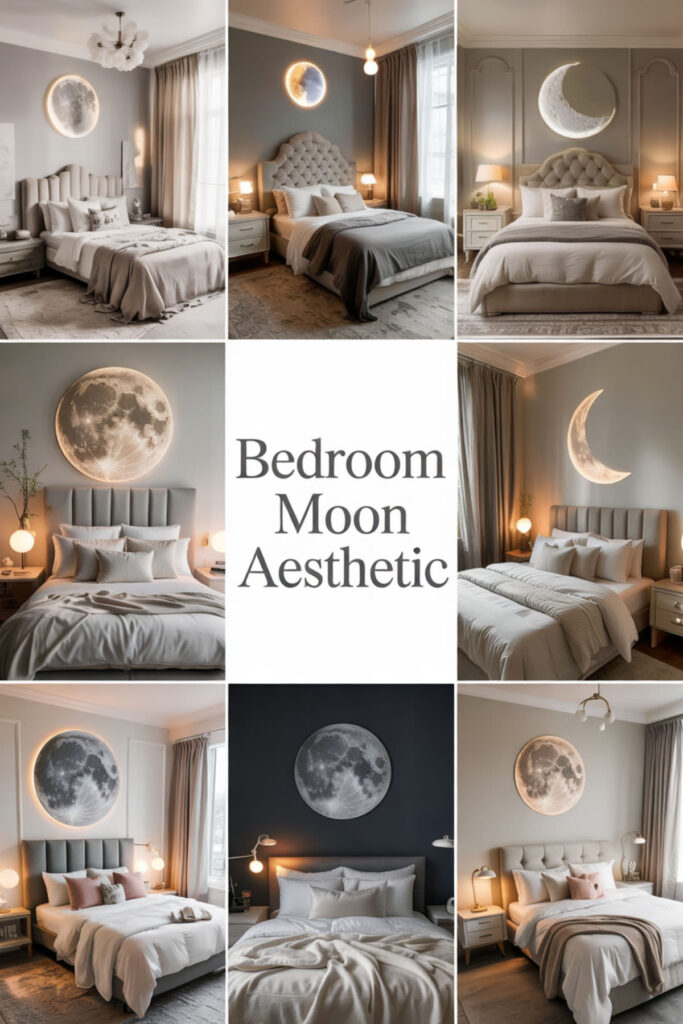 Combine soft minimalism with subtle moon themes. Think pale gray walls, white bedding with silver embroidery, and one stunning moon-inspired art piece.