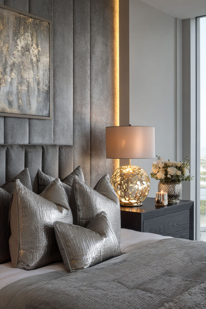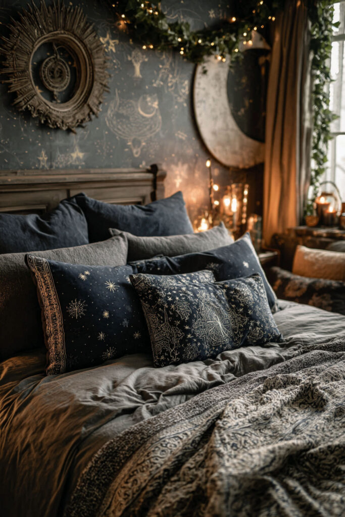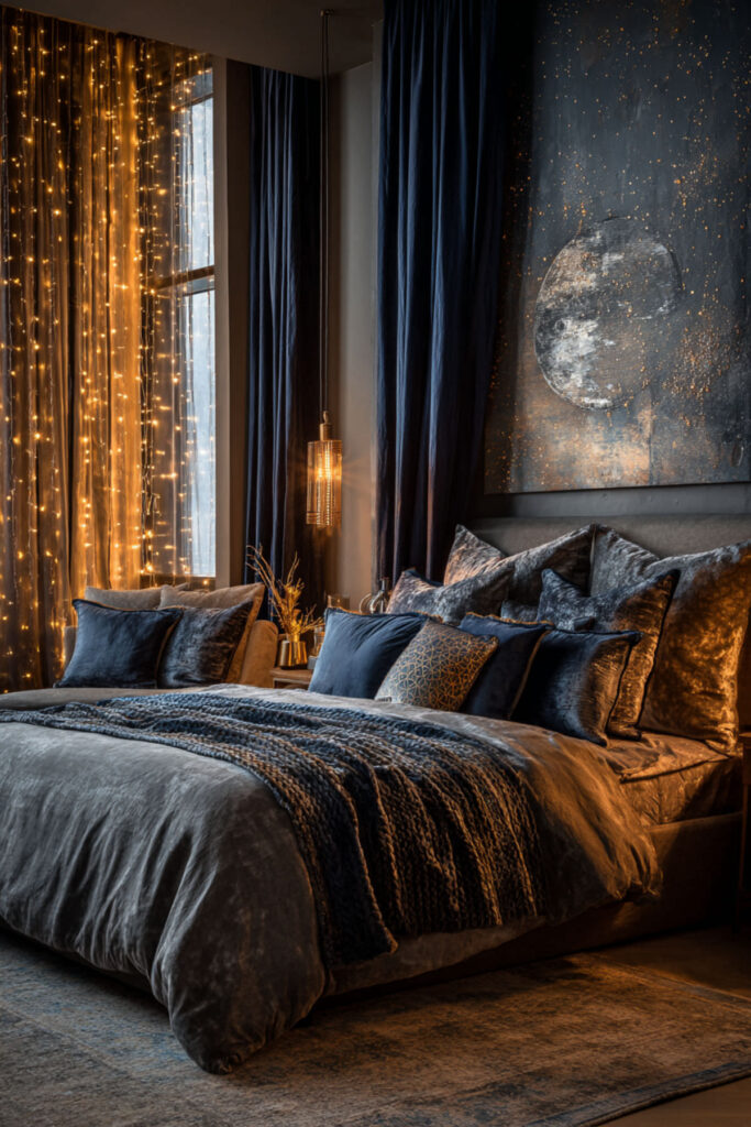 The moon’s surface inspires beautiful textural choices. Think crushed velvet bedding that mimics lunar shadows, silvery silk pillows that catch light like moonbeams, or nubby linen in gray tones.