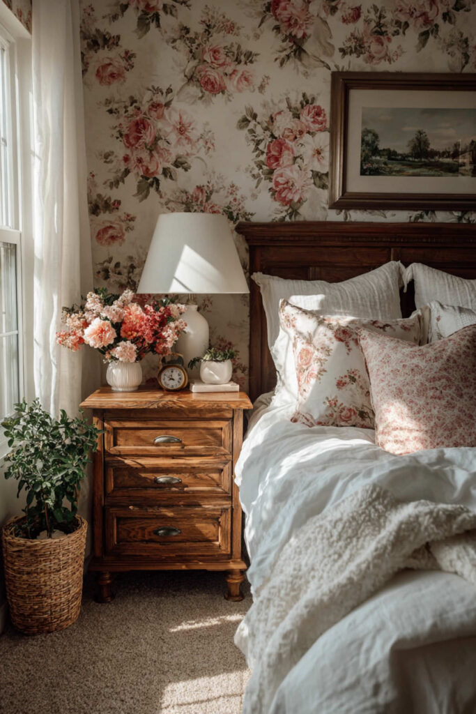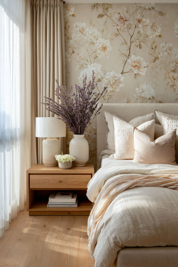 I really recommend investing in one high-quality floral element – maybe a beautiful upholstered bench or custom curtains. Pair with solid, luxurious bedding and minimal accessories. This approach says “elegant woman who knows herself” rather than “trying too hard.”