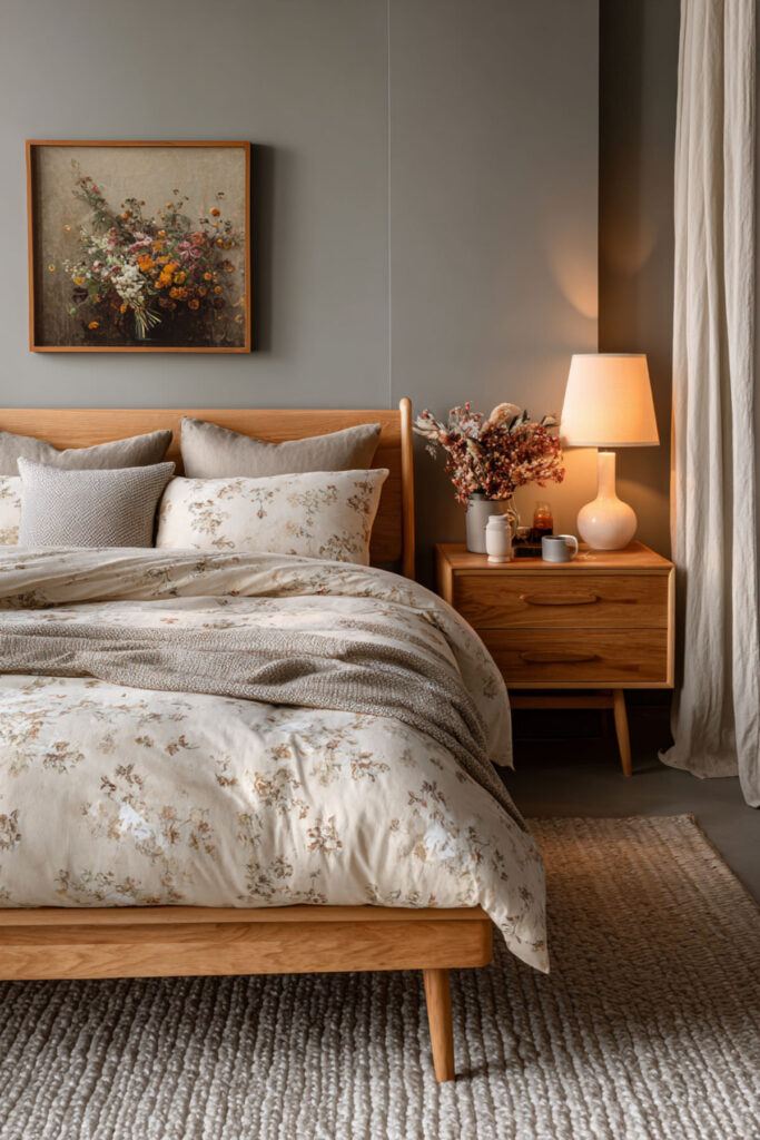 The combination of gray, natural wood, and muted florals creates this grounded feeling that’s perfect for anxious nights. I highly recommend a wooden bed frame in a light finish paired with gray walls and bedding featuring the palest floral prints.