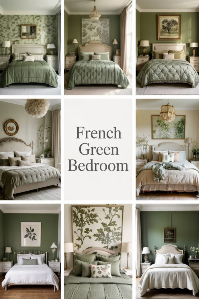 I strongly recommend adding white painted furniture like velvet upholstered platform bed to keep things light. The French approach to bedroom design prioritizes rest and romance – exactly what we need when neither feels easily accessible. Layer different shades of muted green through pillows and throws for depth without chaos.