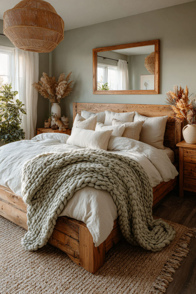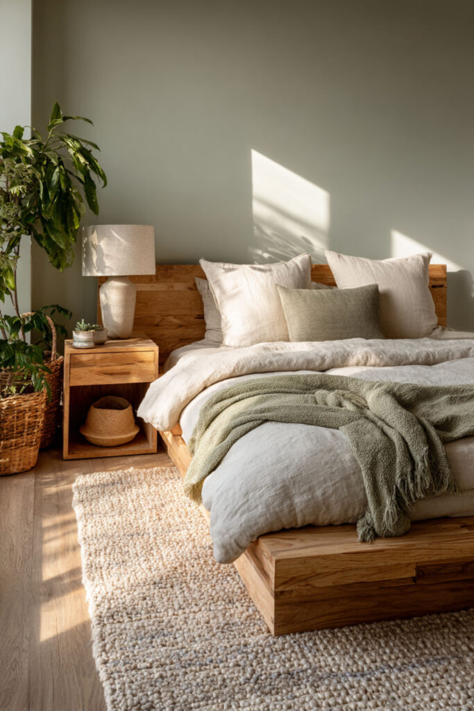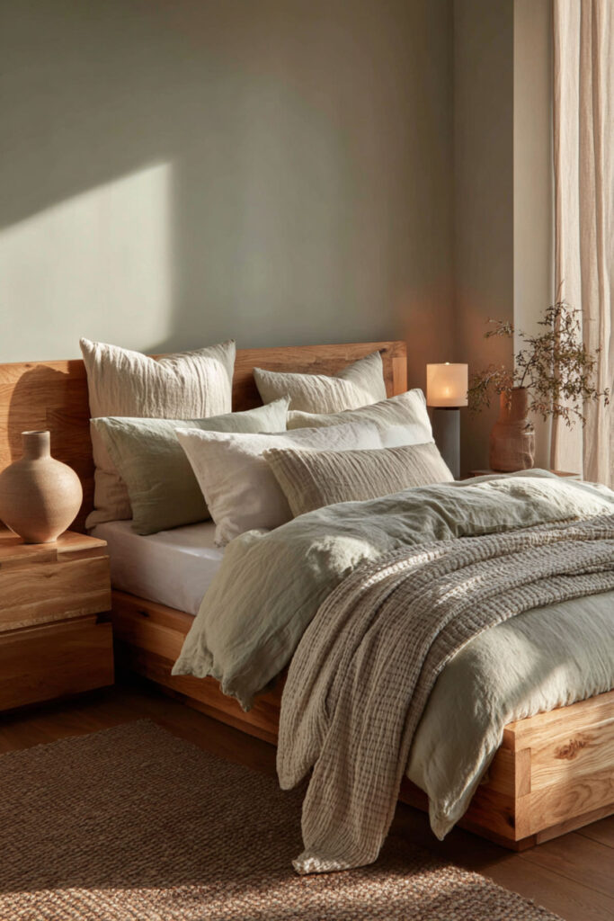 There’s been a steady move toward what designers are calling “restorative spaces” in 2026 — bedrooms designed to genuinely support well-being rather than just look good in a photo. And one of the strongest combinations I’ve seen for this is muted green walls paired with natural wood furniture. Think a light oak bed frame, wooden nightstands, and maybe a small wooden tray on the dresser for your nighttime essentials — water, a cool facial mist, a small fan. The wood tones warm up the green without adding visual noise, and the overall effect feels grounded and earthy. I recommend a solid wood bedside table with clean lines — something that looks intentional but not overly styled. This peaceful bedroom aesthetic works especially well for women who want their bedroom to feel like a retreat they actually look forward to entering at night.