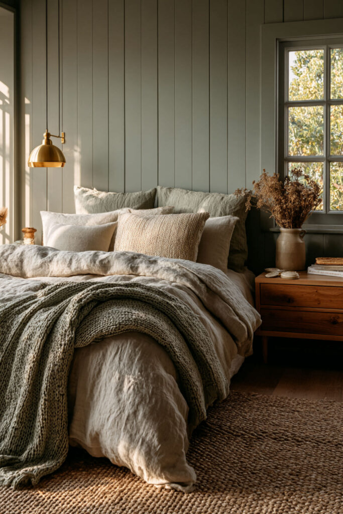 Here’s a color combo that I think more people should try: muted green walls with dusty blue accents. A blue-gray throw at the foot of the bed, a pair of dusty blue cushions, or even blue-toned artwork on the wall. Both colors sit on the cool side of the spectrum, and together they create a bedroom that feels like standing near water — calm, still, and refreshing. This relaxing bedroom color scheme is especially appealing for women who run warm at night because nothing in the palette signals heat. I recommend a set of dusty blue linen pillowcases to add just enough contrast without disrupting the flow. And if you want to push it further, a blue-gray bedroom rug anchors the space beautifully. Let me know what you think — I might be the only one who finds this pairing incredibly underrated.
