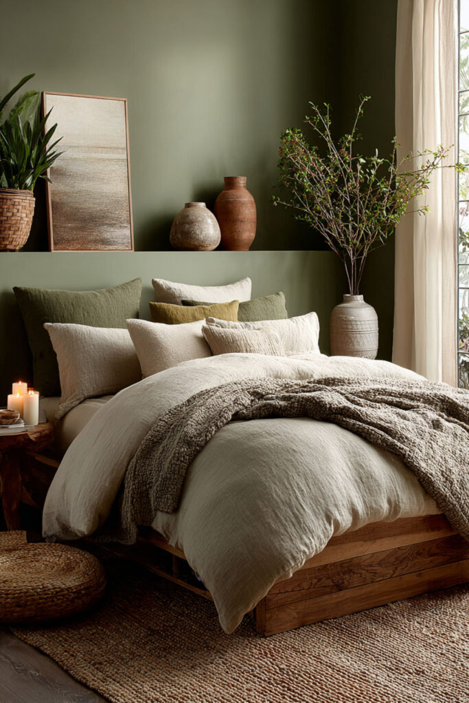 Earthy doesn’t mean boring — it means intentional. Starting with muted green walls and layering in warm earth tones like terracotta, clay, and soft brown creates a bedroom that feels deeply connected to the natural world. A terracotta vase on the nightstand, brown leather handles on a dresser, a clay-colored throw blanket — these small touches pull the room together in a way that feels collected rather than decorated. Warm bedroom colors in earth tones are especially comforting for women going through hormonal shifts because the warmth is visual, not thermal. I recommend a set of handmade ceramic vases in earthy tones for the dresser or windowsill — they bring life to the room without adding heat. This room decor color scheme is one of those timeless approaches that won’t feel outdated in a year or five.