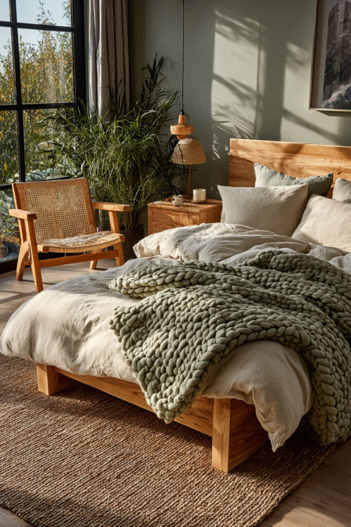 Eucalyptus green is having a major moment right now — Valspar actually named a shade called Warm Eucalyptus as a top color pick for 2026 — and it’s easy to see why. It’s a muted, slightly blue-green that visually reads as cool, which is exactly what you want when your body temperature is unpredictable. Pair eucalyptus walls with lightweight, breathable bedding layers so you can easily toss off a blanket mid-night without unmaking the whole bed. I recommend a bamboo sheet set as your base layer — bamboo is moisture-wicking and stays cool against the skin. Then add a light waffle-weave blanket on top. The whole point is to create a bedroom that adjusts with you, not one that locks you into a fixed setup.