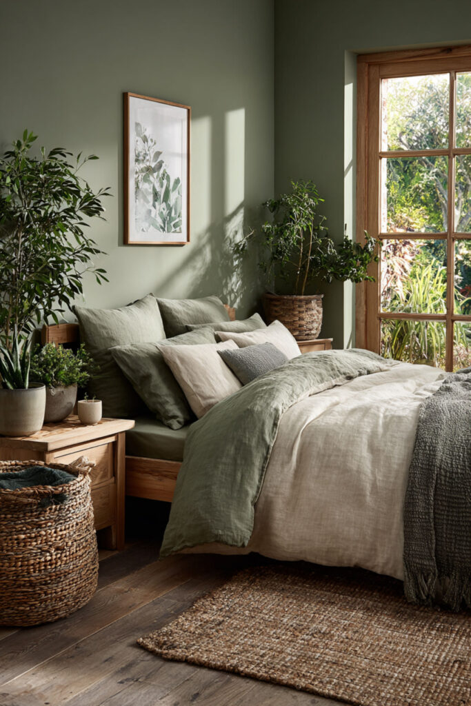 One more thing — if you want to bring your muted green bedroom to life (literally), adding a few well-chosen plants is a beautiful finishing touch. A trailing pothos on a shelf, a snake plant by the window, or a small fern on the nightstand — these connect the green of your walls to something living and breathing. Some indoor plants even help improve air quality, which is a genuine bonus when you’re trying to optimize your sleep environment. The aesthetic wall colour combination of muted green paint and actual greenery creates this layered, dimensional look that photos don’t quite capture — you have to see it in person. I recommend starting with one or two low-maintenance plants that thrive in bedroom light. They soften the room, add texture, and remind you that calm is something you’ve designed into your life on purpose.